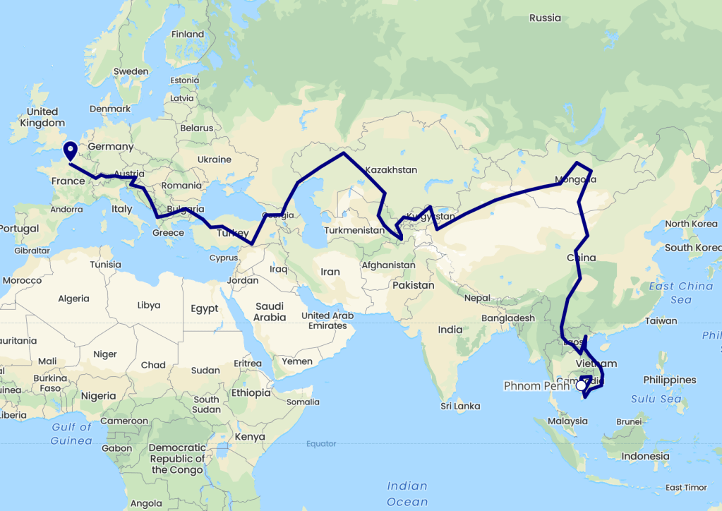 Initially, the aim of the trip was to reach Bangladesh, the cradle of microfinance (popularized by Muhammad Yunus, 2006 Nobel Peace Prize winner), by one means or another. Unfortunately, after talking to several people in Kyrgyzstan, Mongolia and Vietnam, I concluded that it would be impossible to travel by land and on foot in the target regions during the months corresponding to the Paris-Bangladesh flightless journey from March to August 2024. So the itinerary was reversed to avoid the “great cold” of Mongolia and Kyrgyzstan, which lasts most of the year, and to avoid the rainy season in South-East Asia, which generally lasts from June to October. Doing the itinerary in this way allows me to carry out my documentation, get to rural places on foot and move around by land transport more easily.